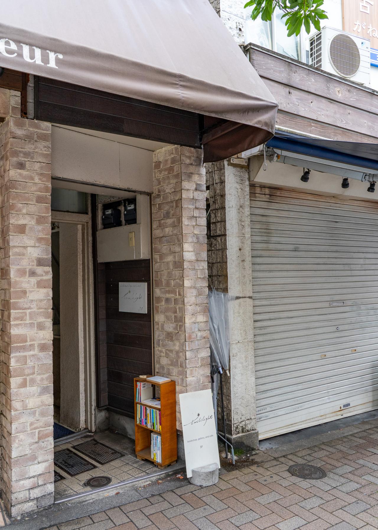 今回は三軒茶屋のメイン商店街である茶沢通りを歩き、独立書店〈twililight(トワイライライト)〉を訪ねる。三軒茶屋駅から約5分ほど歩くと、目的のビルに到着。入り口にはさりげなく看板が設置されており、まさに隠れ家的な雰囲気がある。