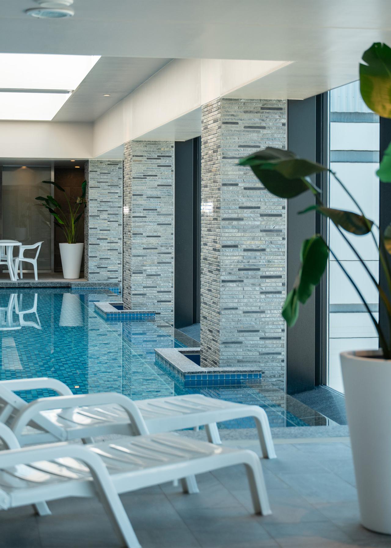 ホテル内には天井が高く開放的な屋内プールも完備されています。ガラス張りの窓からはたっぷり自然光が入り、まるで水辺のリゾートにいるかのような気分に。プールはしっかりと泳げる広さがあり、リラクゼーションや軽い運動にぴったり。周囲にはデッキチェアが並んでいて、泳いだあとはそのままのんびり休憩するのもおすすめです。ここに宿泊する際は水着を忘れずに。