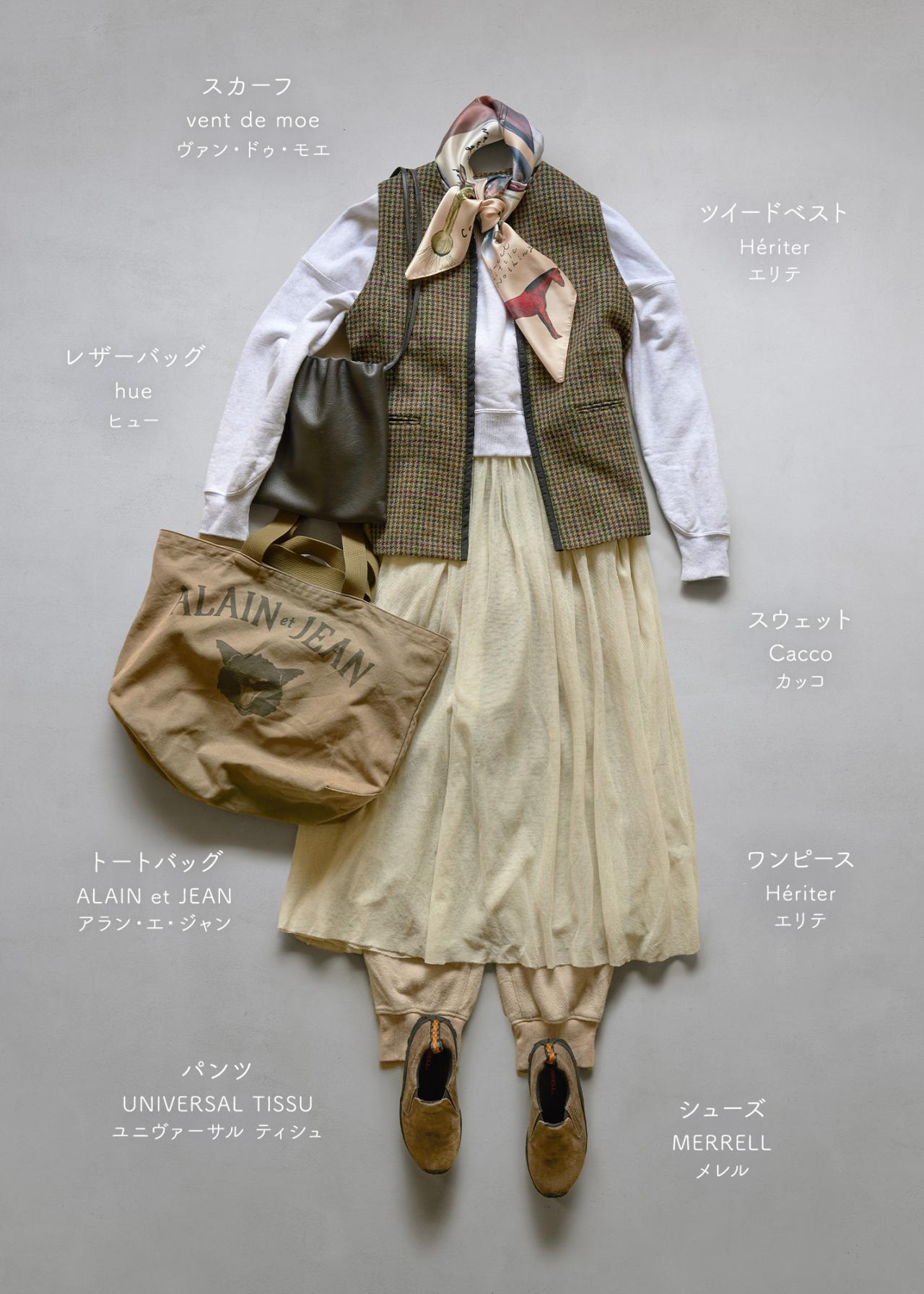 秋らしいツイードのベストを主役にしました。白い服が好きで、普段からよく着ているのですが、コットンチュールのワンピースは、軽い着心地でしわにもなりにくく、装いに華を添えてくれるので旅の時に重宝しています。Q6. 旅の装いを選ぶとき、なにを一番意識しますか?