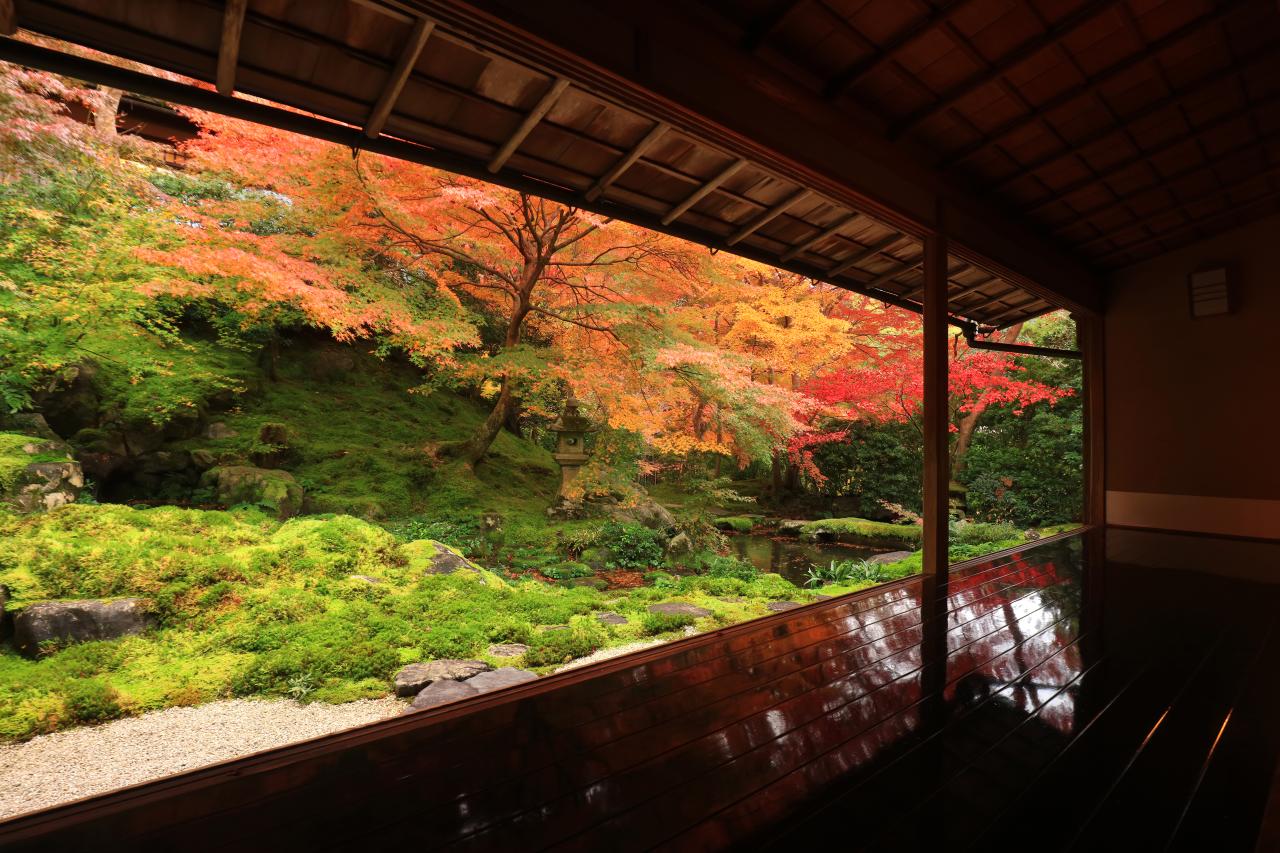 かま風呂を後にして院内を進むと、「机の部屋」のちょうど真下へ。紅葉と主役争いをするかのような美しい苔に目が奪われる。それぞれの彩りだけでなく、苔とモミジのコントラストもじっくりと目に焼き付けたい。