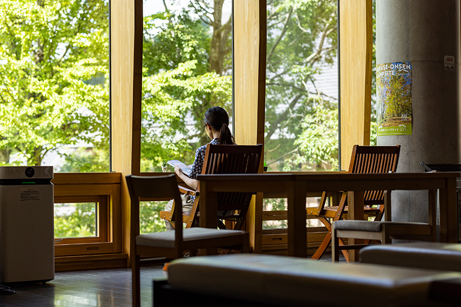 散策後の心地よい疲労感を癒してくれるのは、自家源泉の天然温泉と、ゆったりとくつろげるゲストハウス。客室はベーシックな洋室や和室から、家族連れでもゆとりのあるデラックスルームなど全6タイプ。どの部屋も天井が高く、梁を生かした造りが印象的だ。随所に木材が贅沢に使われた温もりのある雰囲気で、旅の特別感を味わいながらも、ゆったりと自然体でくつろぐことができる。