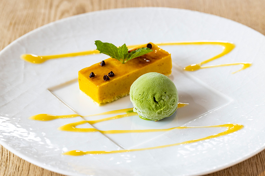メイン料理は、富山産の鯛をこんがりと焼き上げたグリル。カリリと香ばしい皮目と対照的に、肉厚の白身はふわりと優しく口の中でほどけ、バターのコクたっぷりのソースブールブランとよく絡み合う。レモンの風味も爽やかで、あっさりした後味も心地いい。デザートは濃厚なグラムプリンとほろ苦い抹茶アイス。コーヒーや紅茶とともにゆっくりと味わって、食後の余韻に浸ろう。