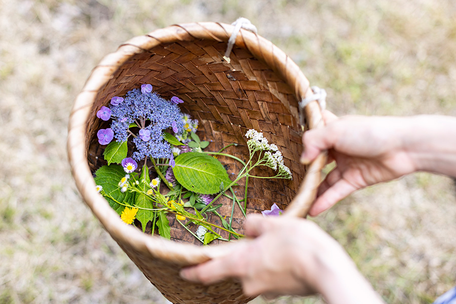 「食べられないものは私が教えますので、それ以外はぜひ味見してみてください」と旭さん。真夏間近のこの日に収穫できたのは、コシアブラやタラの芽、山椒といった山菜に、ニガイチゴやクローバー。森に茂る植物を食べられるかどうかの視点から観察するのは、とても新鮮な体験だ。幼い頃に道草をしながら、草花や木の実を摘んでいた懐かしい記憶がよみがえり、童心に帰ってわくわくする。食材と一緒に、テーブルを彩るための色鮮やかな草花もカゴの中に入れていく。