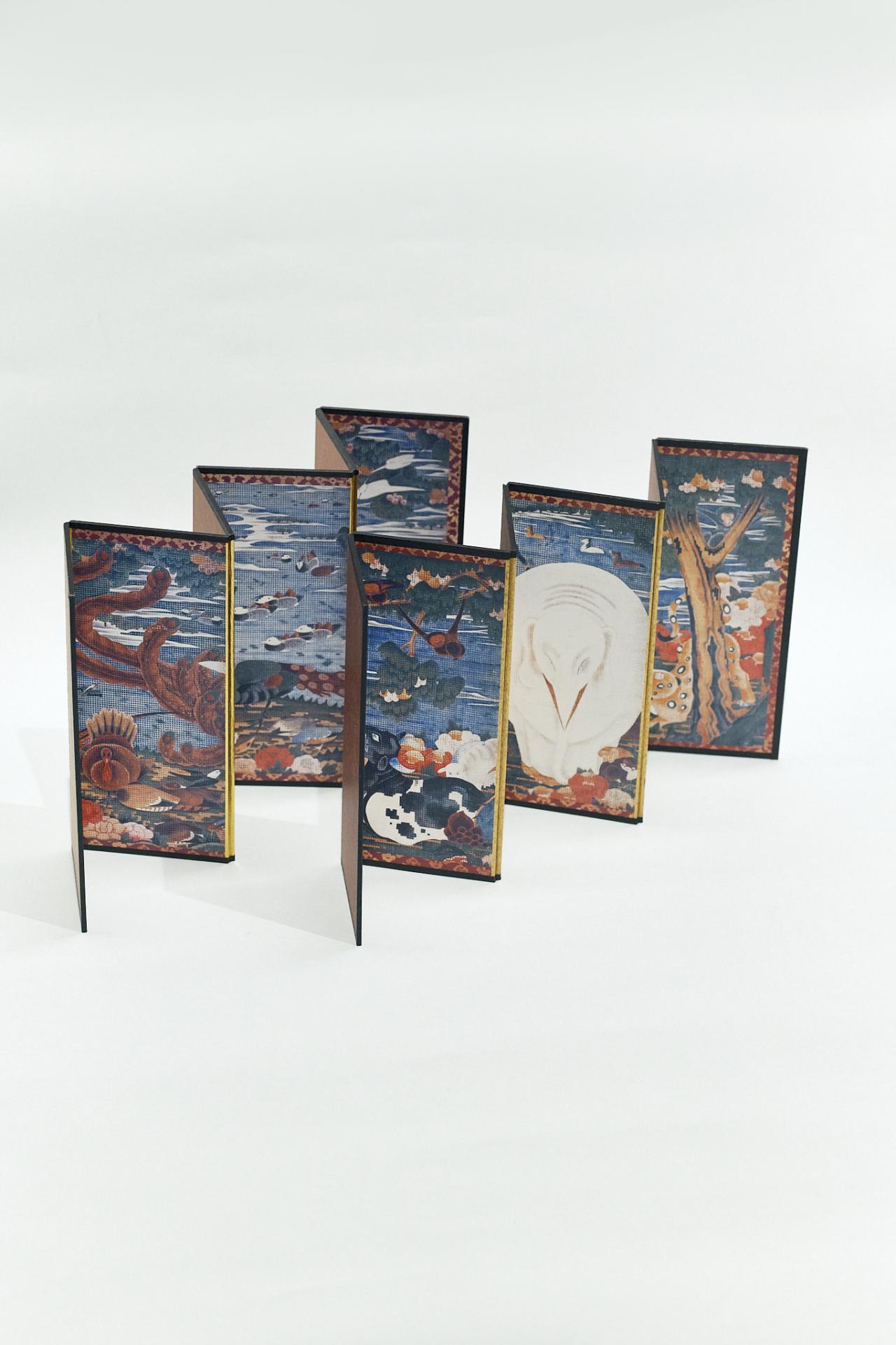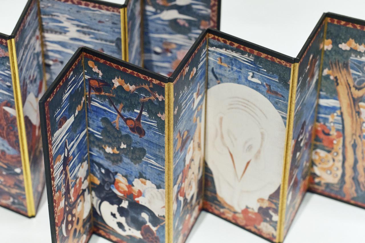 これは「樹花鳥獣図屏風」をミニチュアにした屏風。その場の雰囲気をパッと変える存在感で、インテリアにぴったり。