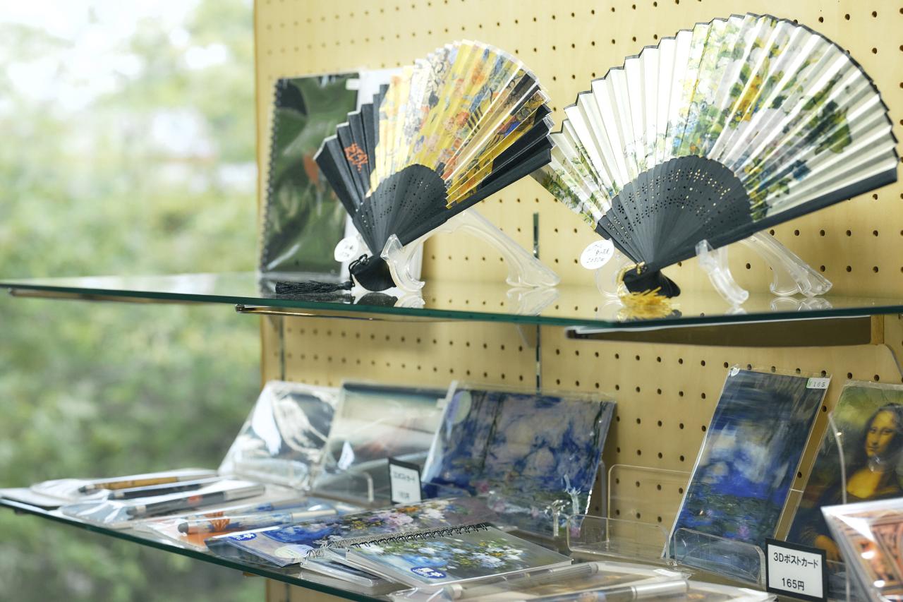 所蔵作品の他にも、国内外の有名なアーティスト作品をモチーフにしたものが色々と揃えられている。スカーフや扇子、Tシャツなどは落ち着いたデザインのものが多く、大人でもさりげなく取り入れられそう。